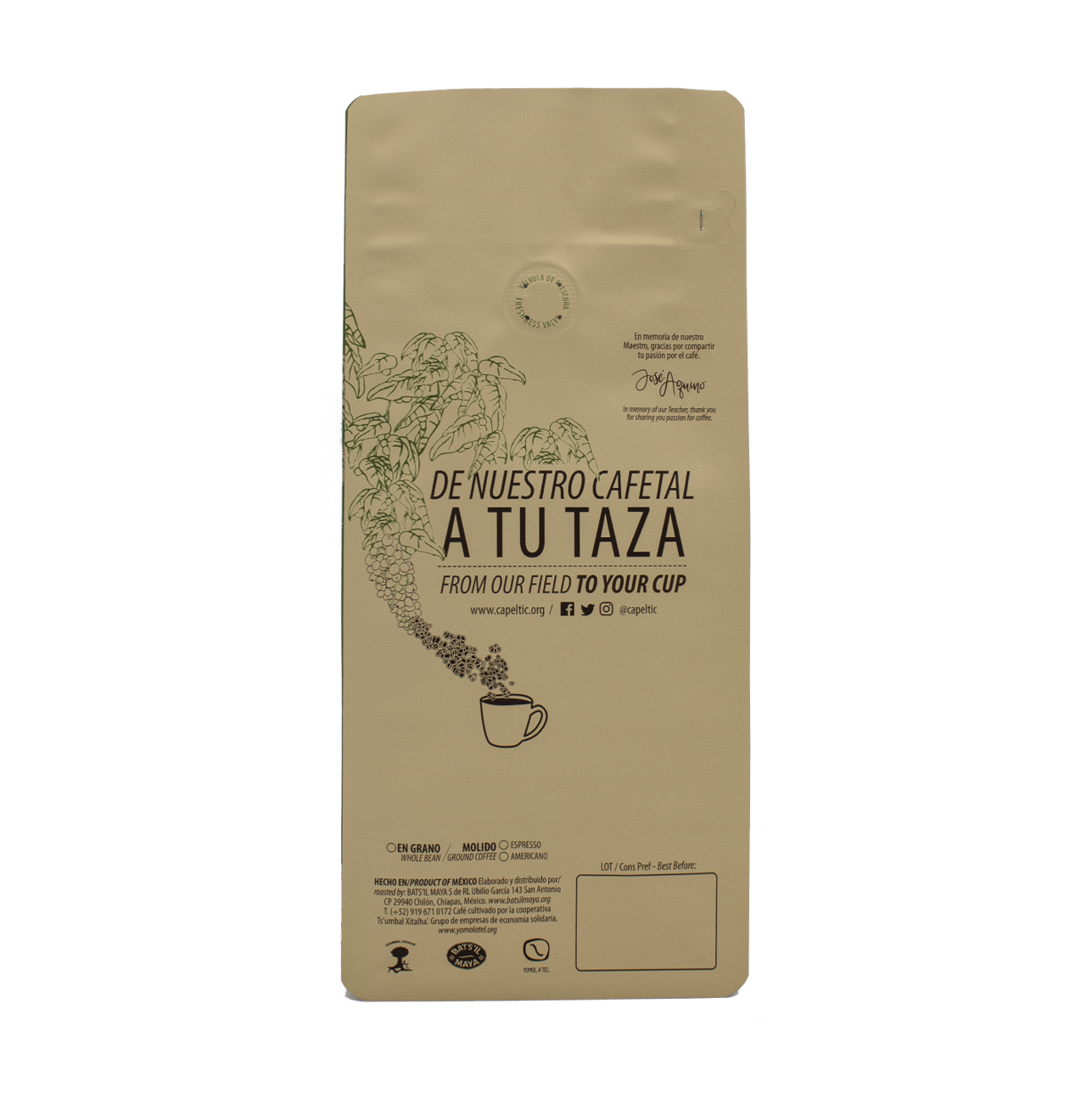 En homenaje a nuestro Maestro Catador. Grano Caracolillo. Un café delicado, fresco y limpio, con notas que nos recuerdan al tamarindo y un retrogusto persistente al limoncillo. Origen: Chiapas, México Altura: 900 a 1,400 ms.n.m. Varietal: Typica, Bourbon, y Oro Azteca Proceso: Lavado