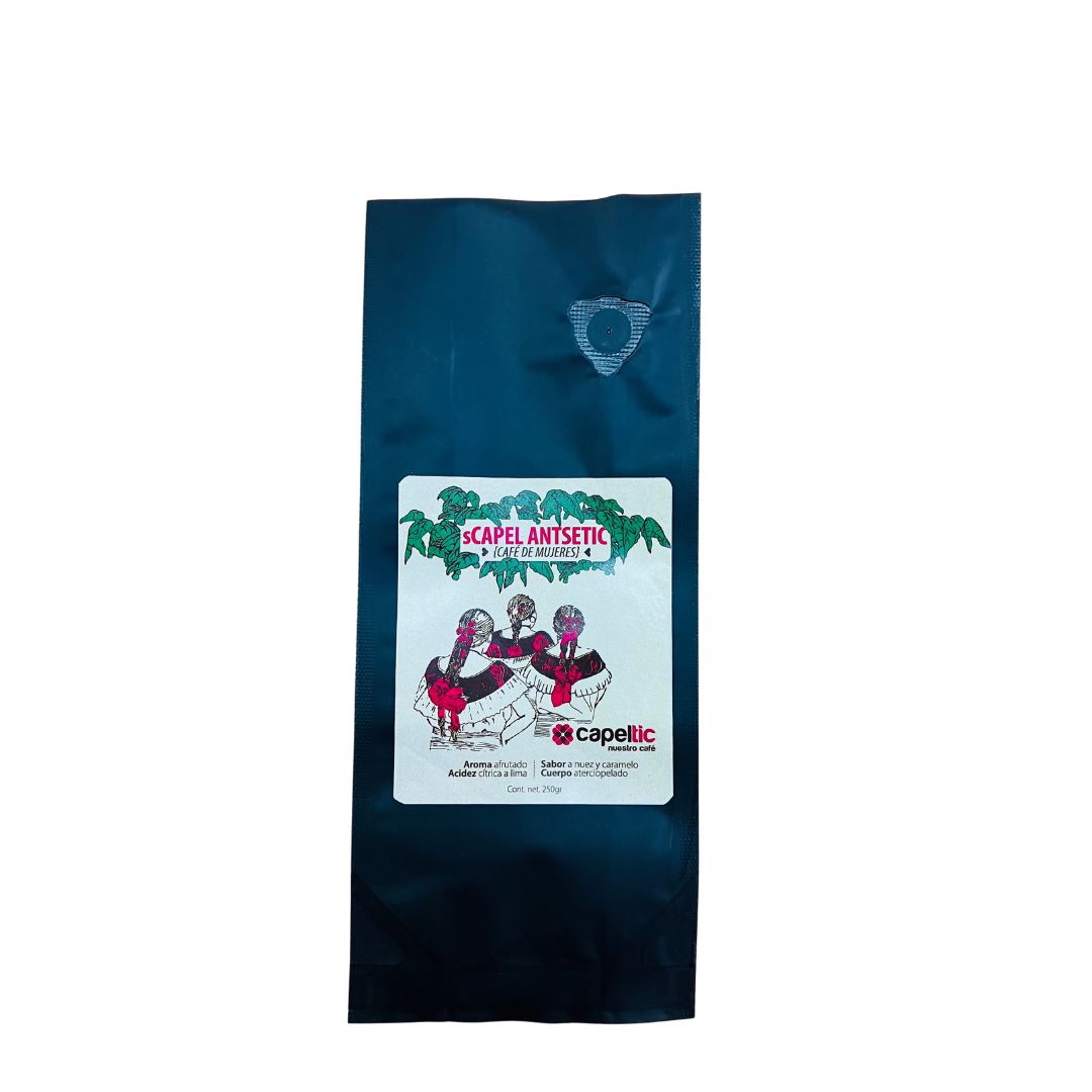 sCapel Antsetic, en español: Café de Mujeres. Producido en campo por el esfuerzo de las mujeres cafetaleras de la cooperativa Ts’umabl Xitalha’ De aroma afrutado, sabor acaramelado, cuerpo aterciopelado y una acidez cítrica discreta con tono a lima y durazno. Origen: Chiapas, México Altura: 900 a 1,400 ms.n.m. Varietal: Typica, Bourbon, y Oro Azteca Proceso: Lavado
